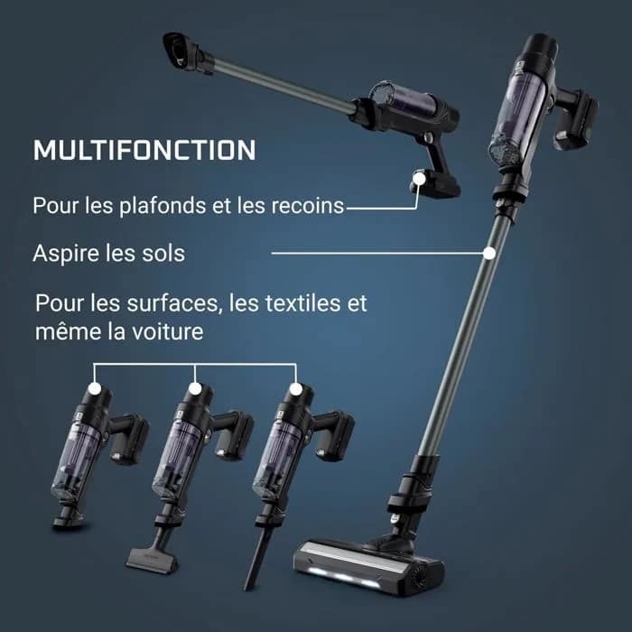 - Léger (1.2kg) +brossette multi-usage + brosse pour canapé + suceur plat + base de charge murale