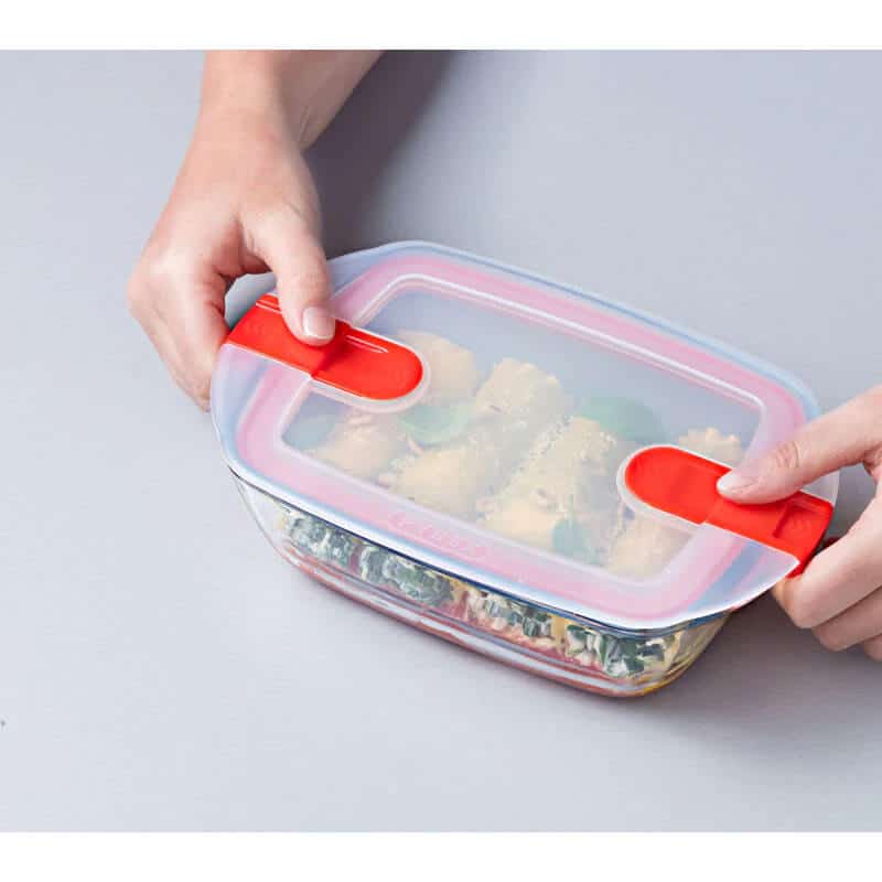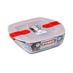Boîte Carré PYREX – Taille : 1.1 L – Dimension : 23 x 15 cm – Matériau : Verre – Compatible four – Compatible micro-onde – Résistant aux chocs thermiques : de -40° jusqu’à 300° – Température min : -40°C – Ce plat est fabriqué à partir de matériau hygiénique qui permet de résister aux rayures – Plat à four en verre ultra-résistant qui se nettoie facilement au lave-vaisselle – Prise en main facile même avec des maniques grâce à ses deux poignées grips – Couleur : Transparent