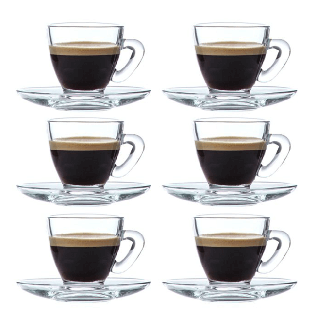 Lot de 6 tasses à café avec sous Tasses Daily Coffee – 12 pièces comprenant 6 tasses et 6 sous-tasses. Ces tasses ont une capacité de 9 cl et conviennent à toutes les ambiances de table. Elles résistent à la chaleur de votre café et sont fabriquées en verre de qualité transparente.