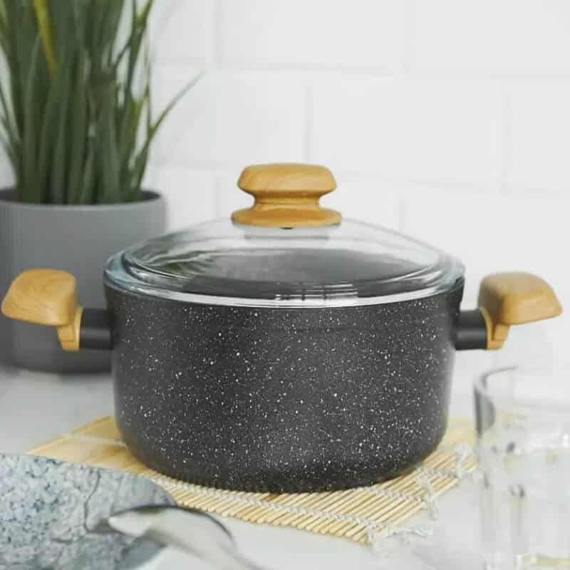 Matière: Granit – Volume : 5 L – RevĂŞtement avec d’excellentes propriĂ©tĂ©s antiadhĂ©sives sur les surfaces intĂ©rieures – RĂ©sistance et rĂ©sistance supplĂ©mentaires contre les rayures – Technologie de production respectueuse de l’environnement – Cuisiner sans gaz toxique – Couleur : Noir