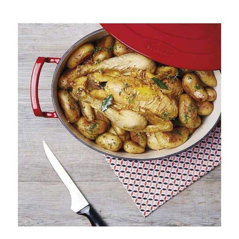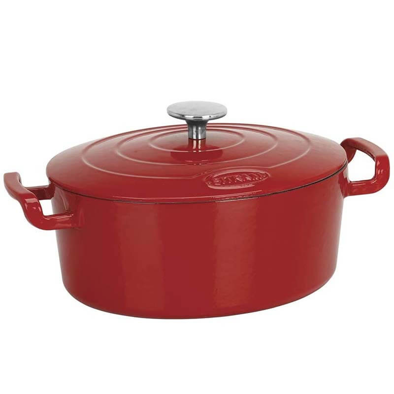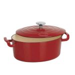 Faitout Sitram Fonte Oval  – Taille : 21.6 x 34x 11.5 cm – MatĂ©riau : Fonte d’acier Ă©maillĂ©e – CapacitĂ© : 4 Lites – Tous feux dont induction – Peut ĂŞtre passĂ© au four – Avec bouchon en inox – Gamme : Sitrabella – Couleur : Rouge