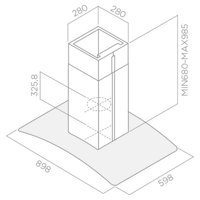 Hotte Centrale FOCUS – Largeur: 90 cm – 3 vitesses  Classe énergétique: A – Débit d’air: 850 m3/h – Eclairage: 2 Spots Halogène x 20W – Filtre aluminium lavable – Diamètre évacuation : 150 mm – Boutons – Couleur: Inox & Vitre – Garantie: 2 ans