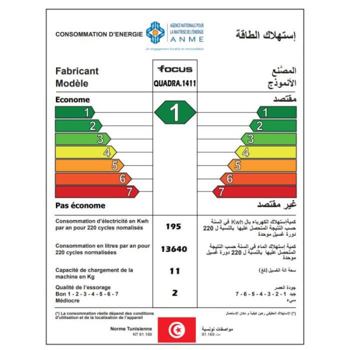 Lave Linge Frontal FOCUS – CapacitĂ©: 11 kg – Consommation d’eau pour 220 cycles nomalisĂ©s: 13640 litres/an – Vitesse d’Essorage: 1400 tours/min – Classe ÉnergĂ©tique: A+++ – Consommation d’électricitĂ© pour 220 cycles nomalisĂ©s: 195 kwh/an – Nombre de programme: 15 programmes – DĂ©part diffĂ©rĂ© de 1 Ă 23 heures – Tambour en inox – Dimensions: H x L x P: 84.5 x 59.7 x 63.2 cm – Couleur: Silver – Garantie: 2 ans