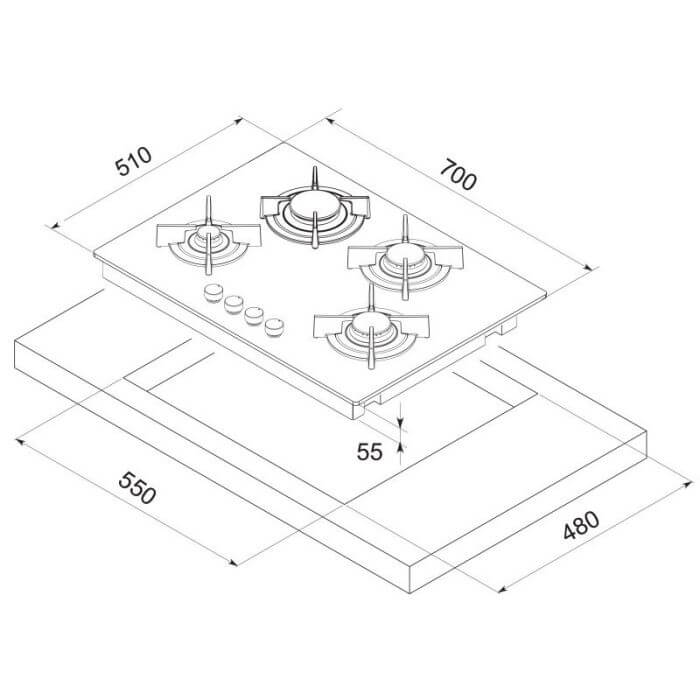 Plaque de Cuisson Encastrable FOCUS – Type de Plaque: à Gaz – Largeur: 70 cm – Nombre de Foyers: 4 Foyers – Grilles et chapeaux de brûleurs émaillée – Flamme stabilisée – Commandes frontales – Allumage Automatique – Revetement vitro -Dimensions: 700 x 510 x 55 mm – Couleur: Noir – Garantie: 2 ans