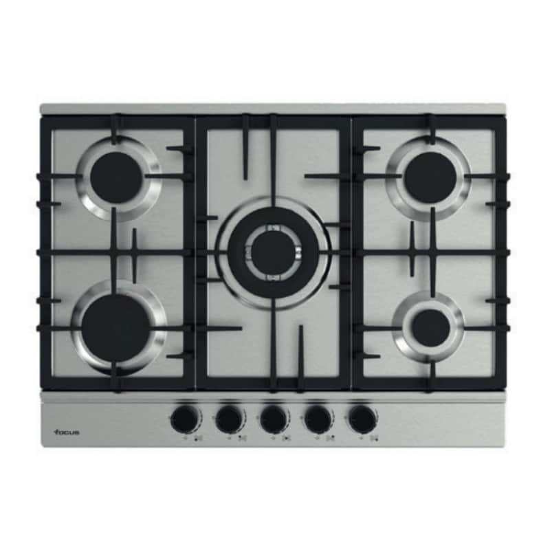 Plaque De Cuisson Focus – Nombre de feux : 5 – Largeur : 70cm – 5 Brûleurs à gaz, l’un double couronnes – Flamme stabilisée – Thermocouple – Grilles et chapeaux en fonte – Allumage Automatique – Commandes frontales – Couleur: Inox – Garantie: 2 ans