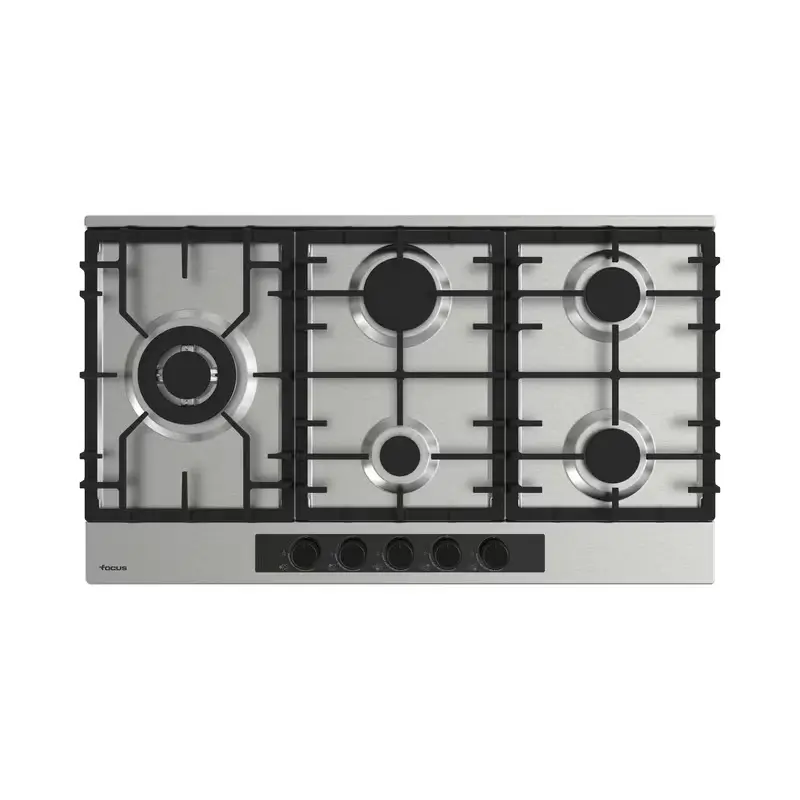 La plaque de cuisson FOCUS Inox 90 cm est équipée de 5 brûleurs à gaz puissants, dont un brûleur triple couronne idéal pour une cuisson rapide et homogène. Parfaite pour les cuisines familiales ou gastronomiques, elle garantit une excellente répartition de la chaleur.