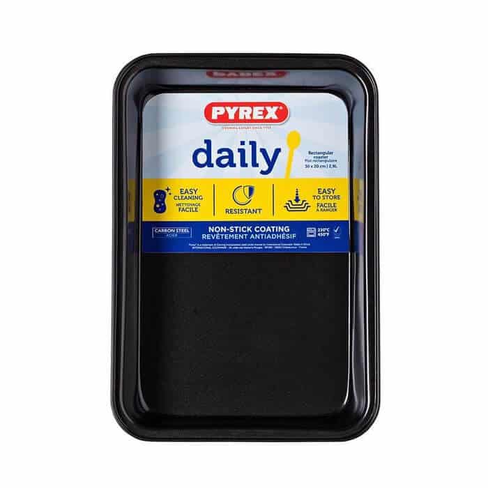 Plat Rectangulaire PYREX DAILY – Taille: 32 x 22 cm – Plat rĂ©sistant aux chocs thermiques: de -40° jusqu’Ă  230° – Matière: MĂ©tal – RevĂŞtement antiadhĂ©sif – Cuisson homogène – Ne retenant ni les taches ni les odeurs – Plat dotĂ© d’une plus large profondeur pour avoir davantage de prĂ©paration gourmande – Design Ă©purĂ© et fonctionnel – Facilite le nettoyage et le rangement