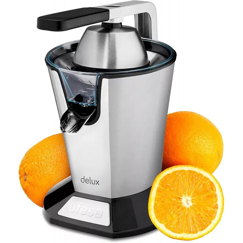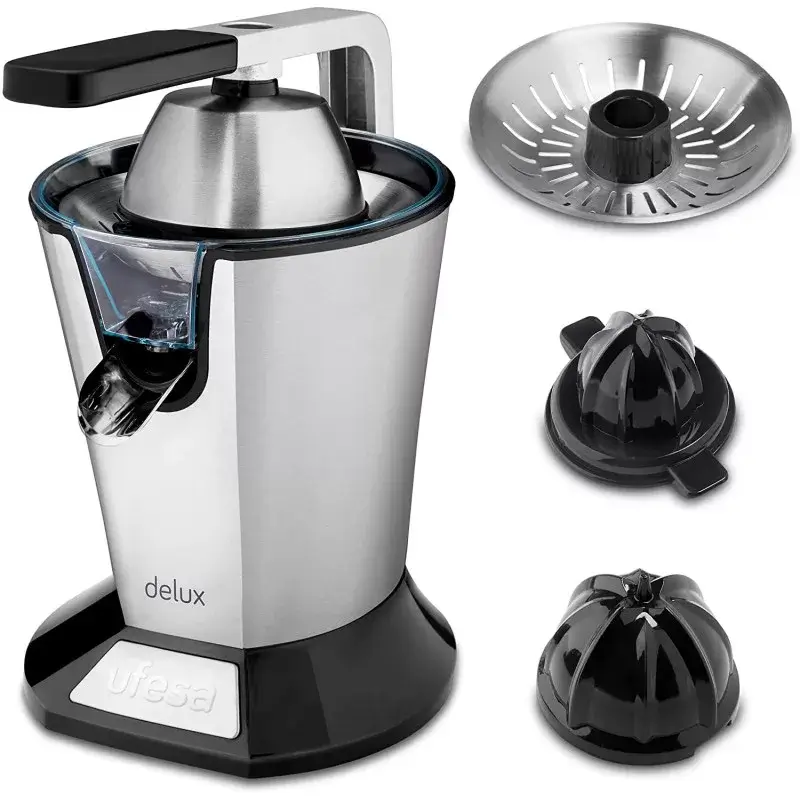 Presse Agrume UFESA EX4950 – Puissance: 600W – Matériel: Inox – Déversement continu – Système anti-goutte – Double sens de rotation – Double cône – Filtre en acier inoxydable – Bras pour faciliter l’extraction du jus – Couleur: Inox – Garantie: 1 an