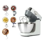 Robot pĂątissier multifonction Kenwood compact PROSPERO – Puissance : 1000 W – Vitesse : Variateur + Pulse  – CapacitĂ© du bol : 4.3 L -Nombre de vitesse: 6 Vitesses – FonctionnalitĂ©s : MĂ©langeur, centrifugeuse, dĂ©chiqueteur, pĂ©trin, hachoir, batteur – Accessoires adaptables: Accessoire batteur, bol mixeur, accessoire centrifugeuse, batteur , disque de mixage – Couleur : Silver – Garantie : 1 an