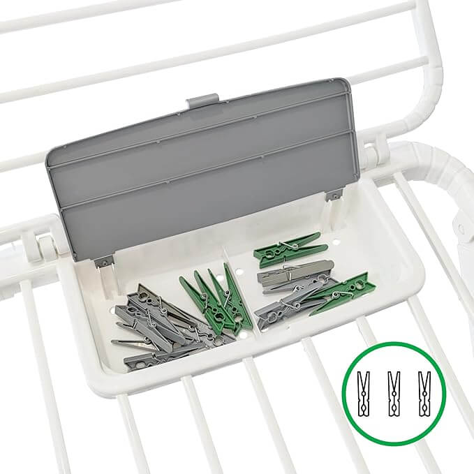 - Contient deux roulettes pour faciliter son déplacement et un bac de pinces à linge intégré.