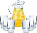 Service Boissons Arcopal Orient – Matière : Verre – Nombre de pièces : 7 ( 1 broc + 6 verres ) – Forme : Cylindre – Capacité : ( 1 x 1.8 l + 6 x 27 cl) – Idéal pour un usage personnel et des événements spéciaux – Ajout une touche d’élégance à votre table – Design simple et moderne – Peut-être laver au lave-vaisselle – Couleur : Transparent