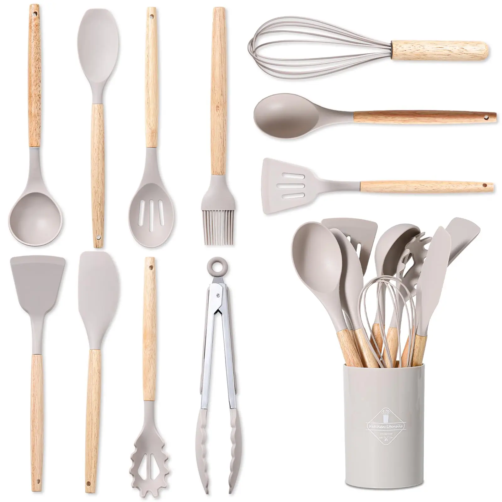 Set D’ustensiles De Cuisine – Nombre de pièces: 8 Pieces – Matière: En Silicone – Comprend :une spatule, une cuillère à fente, une cuillère solide, une cuillère à égoutter, un fouet, une brosse en silicone, une pince à nourriture, une cuillère à spaghetti, une spatule à gâteau, une pelle à pizza, un batteur à œufs et un support de rangement – silicone alimentaire résistants à la chaleur – Résistants aux Rayures – Poignées Ergonomiques – Facile à Nettoyer – Support de Rangement Inclus – Couleur: Noir