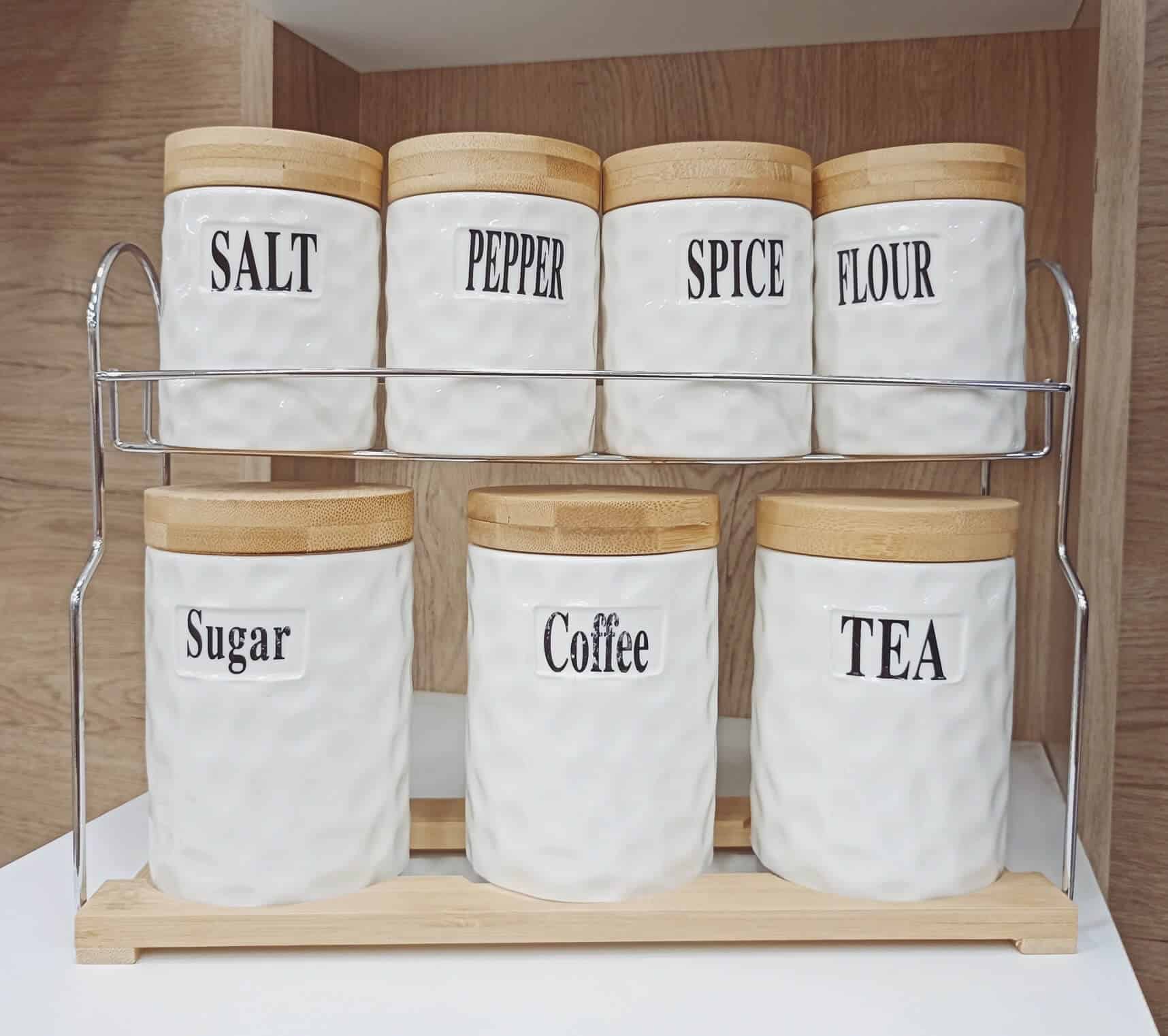 Ensemble de 7 pots à épices en céramique de rangement de sel d’épice, sucre, thé et café avec support accessoires d’ustensiles de cuisine 1 ensemble. La conception réfléchie ajoute à chaque récipient de stockage un couvercle en bois amovible pour empêcher l’humidité et la poussière. Maintenant, Vous pouvez conservez votre épices d’une façon sain. N’hésitez pas de ranger et décorer votre cuisine avec un Boîtes à épices en céramique avec son support . .