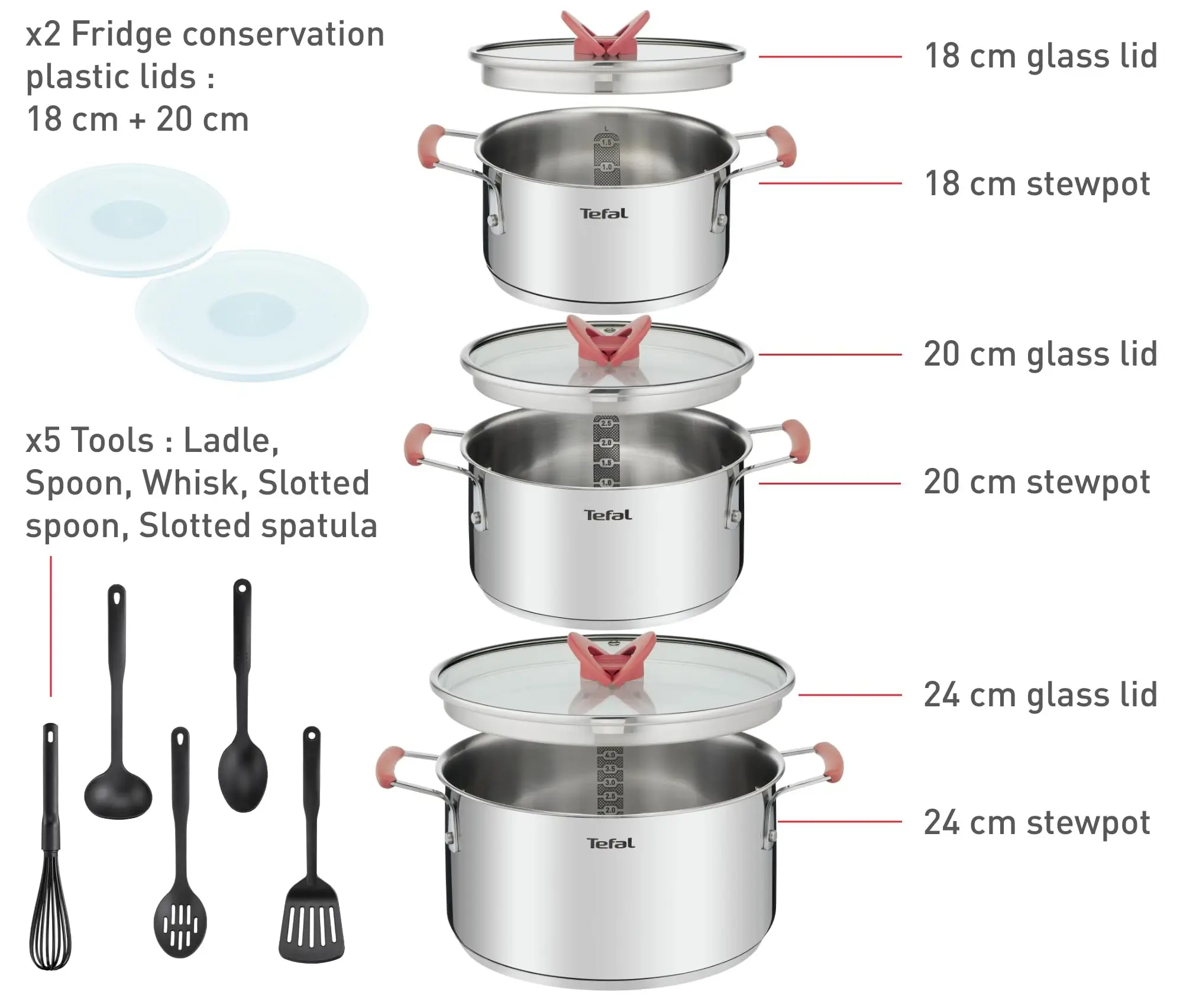 - SET 13 PIECES : Faitouts 18/20/24 cm + couvercles + 5 ustensiles (fourchette, spatule, fouet, louche, cuillère)