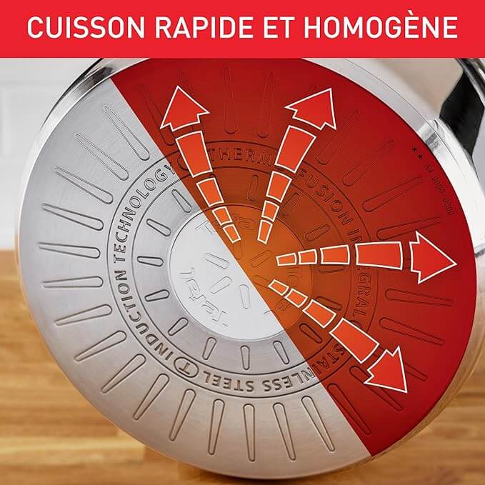 - EXCELLENTE DIFFUSION DE LA CHALEUR: la base composée de trois couches assure des performances durables et une distribution homogène de la chaleur en plus d’être compatible avec toutes les surfaces de cuisson (gaz, électrique, vitrocéramique et induction)